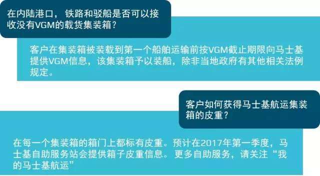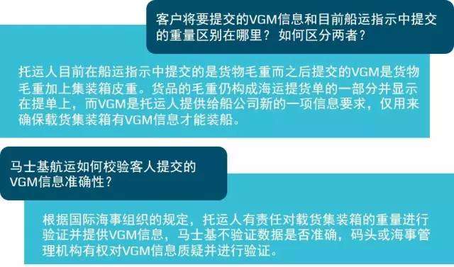 相信大家對集裝箱重量查核(Verified Gross Mass,簡稱VGM)都不再陌生,繼2月份馬士基發布了關于VGM的消息后,為了確保客戶的VGM信息提交順暢和簡化碼頭數據交換流程,這段時間馬士基航運正配合政府相關部門評估新約對客戶和市場可能帶來的影響和變化。在此期間,我們也陸續收到大家的咨詢,這里小編整理了一些相關小知識和常見問題,希望對大家進一步了解這一新規定有所幫助。
