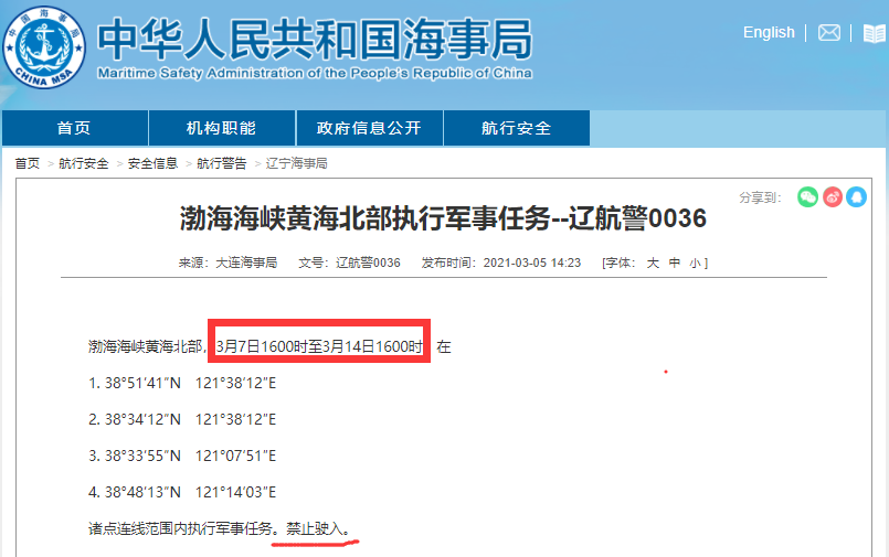 據大連海事局消息:渤海海峽黃海北部,3月7日1600時至3月14日1600時,在