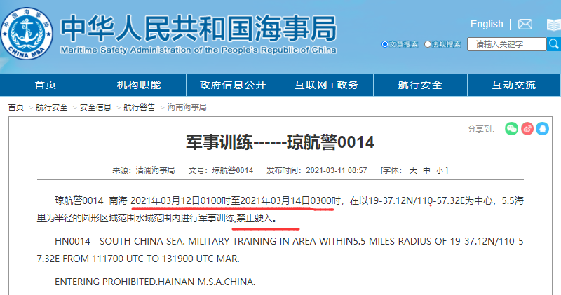 據清瀾海事局消息:瓊航警0014 南海,2021年03月12日0100時至2021年03月14日0300時,在