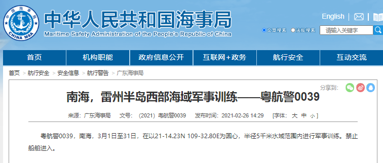 三、南海,雷州半島西部海域軍事訓練——粵航警0039